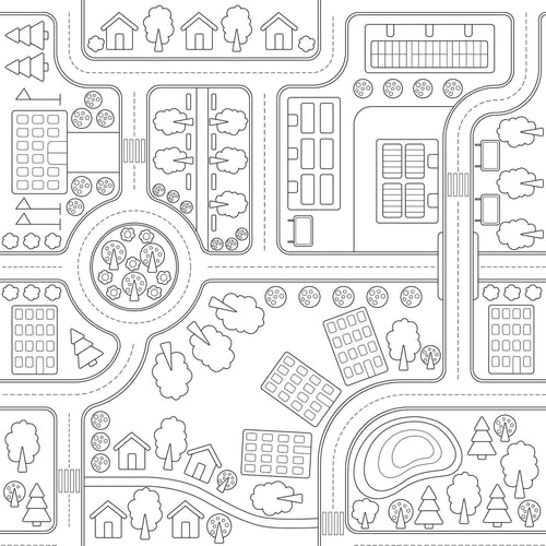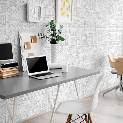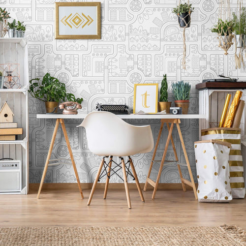 Overlook the city in the comfort of your own home. This themed wallpaper print presents a small town hall landscape, with a geometric style design. An assortment of shapes and imagery composes this scene, combining a simplistic white canvas with the classic black print.